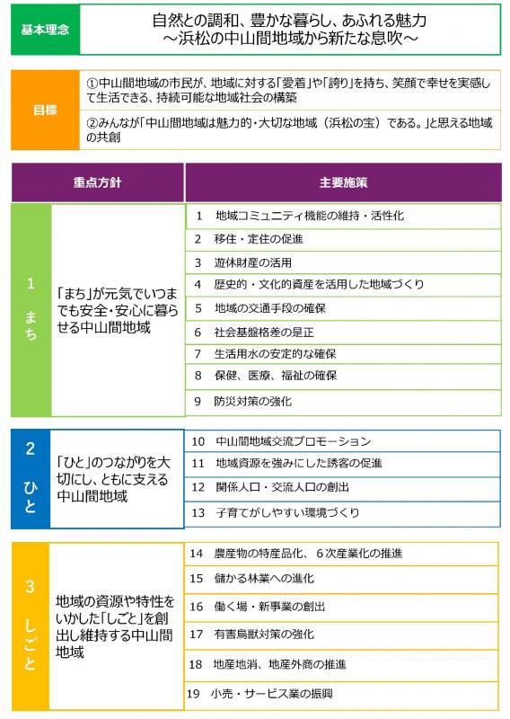 この基本理念は、中山間地域の魅力や特長に加え、都市部の暮らしをも支える中山間地域の多面的機能から着想を得ています。可住地が少ないこと、人口の減少、少子化、高齢化など中山間地域が抱える課題に対応する取り組みが新しい変化の「息吹」となって浜松市全体、さらには市域を超えて波及することを期待して設定しました。
