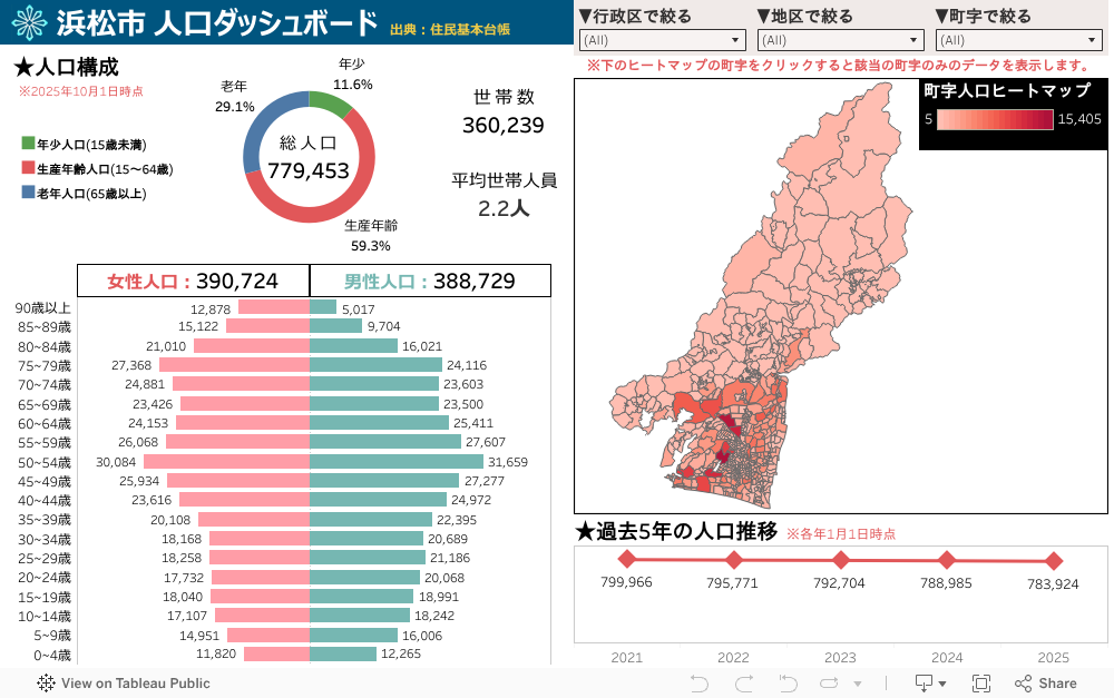 Tableau(タブロー)というデータの見える化や分析を行うデジタルツールを用いて作したダッシュボード(様々なグラフや表を組み合わせてデータや情報をわかりやすく表示するツール)を掲載しています。浜松市の住民基本台帳のデータに基づき、浜松市の人口を見える化しています。最小で町字単位まで細かく表示できます。