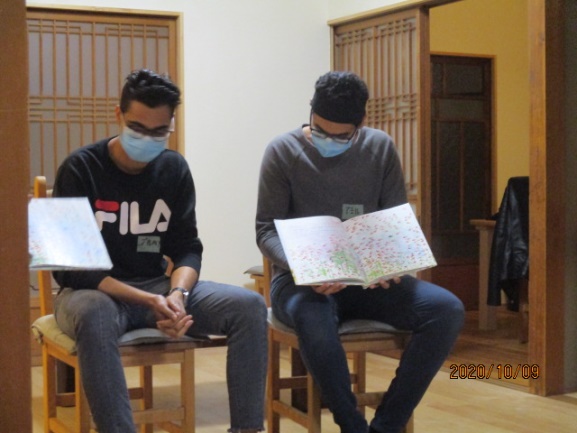 この日の夕食メニューはカレーライスで、「美味しい」と黙々と食べている姿が印象的でした。夕食後は、インドからの留学生とともに、ぬり絵や本読み等を行いました。
