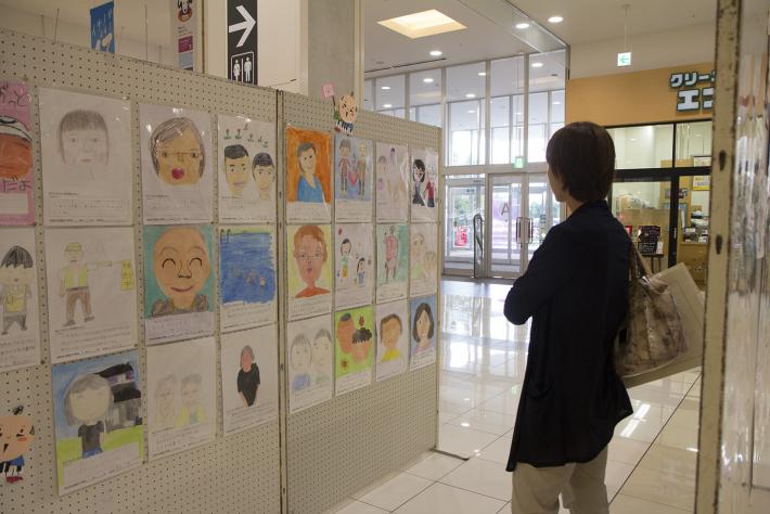 作品展では敬老の日にちなんで、積志小学校の1~6年生の児童が夏休みの課題として描いた祖父母の似顔絵を展示しています。似顔絵の下には「いつもありがとう」や「これからも長生きしてね」などと、祖父母へ向けたメッセージが載せられており、とてもほのぼのとした温かい気持ちにさせてくれました。