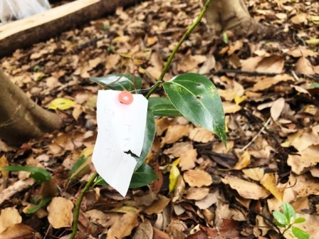 足元を見ると、いくつかの幼木に「切らないでください」の札がついています。この森では種類が少なく、大切にしたい幼木に札をつけているそうです。小さな主張を見逃さないよう注意が必要です。