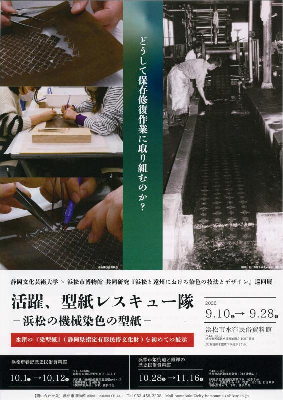 静岡文化芸術大学では、「型紙レスキュー隊」として、型紙の修復に取り組んでいます。今回の展示では、修復した型紙やその工程などを各資料館を巡回して展示していきます。