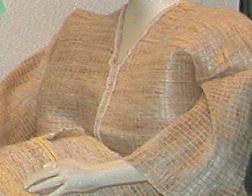 しじみの会では、毎年初夏、カラムシを刈り取ります。つづいて、茎から繊維を剥ぎ取って洗浄し、乾燥させます。ここから繊維にヨリ(撚り)をかけて糸にするのがたいへん時間のかかる作業です。さらに、編み台を使って手作業で布を織り、袖と襟を縫っています。