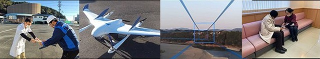ドローンによる医薬品配送(左から、運送・積み込み→離陸→飛行→着陸・受け取り)