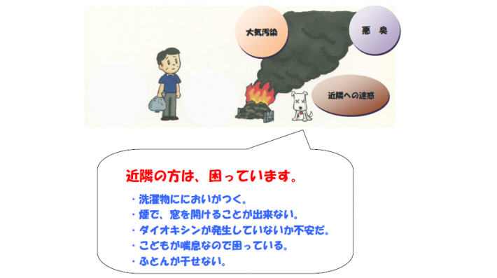 焼却禁止の例外であっても、みだりな焼却や、周辺の生活環境に悪臭等の影響を及ぼしている場合、行政指導の対象となり、焼却を中止していただくことがあります。また、近隣に迷惑とならないよう配慮(※)が必要となります。