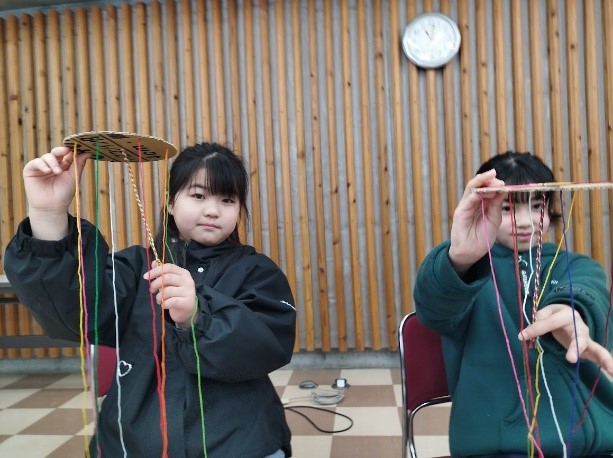 「工作教室」では、リリアン糸で工作をしました。手首にまくミサンガや、ストラップ用にと、目的に合わせて好きな色の糸を選んで編んでいきました。