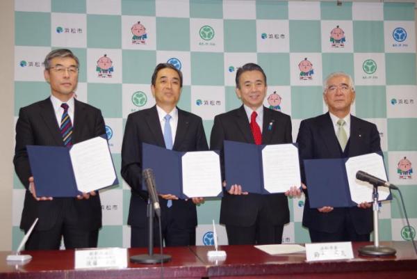浜松市と商工組合中央金庫、静岡銀行、浜松信用金庫は、平成25年12月26日、相互に協力・連携して浜松市内の中小企業の海外ビジネス展開を効果的かつ効率的に支援するため、「海外ビジネス展開支援に関する協定」を締結しました。