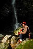 林道を歩くこと30分。先ほどまでは静かだったが、遠くの方で滝が流れ落ちる音が聞こえてきた。「もうすぐそこだよ」と追平さん。後をついて杉林をさらに進むと、突然、目の前に落差20メートルほどの見事な滝が姿を現した。なるほど、確かに秘境という言葉がふさわしい場所だと納得した。追平さんの話では、これが一の滝。さらに二の滝、三の滝があるのだそうだ。「樽山を螺旋状に水が流れているんだよ」と、山の方を指差しながら追平さんは教えてくれた。