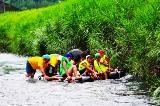 上流までいかだをみんなで引いて行き、一斉にその上に乗り込んだ子どもたち。3隻それぞれに、オリジナルの旗が掲げられ、準備は整った。