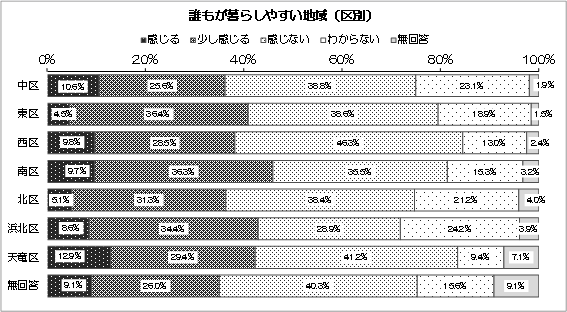 自分の住む地域が、誰もが暮らしやすい地域だと感じるかについては、「感じる」8.7%、「少し感じる」31.1%と合わせて39.8%となり、一方で「感じない」が38.3%、「わからない」は18.2%であった。
