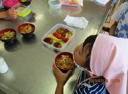 野菜がたくさん入ったスープも作って、ごぼう入りハンバーグの完成!それではみんなでいただきます!